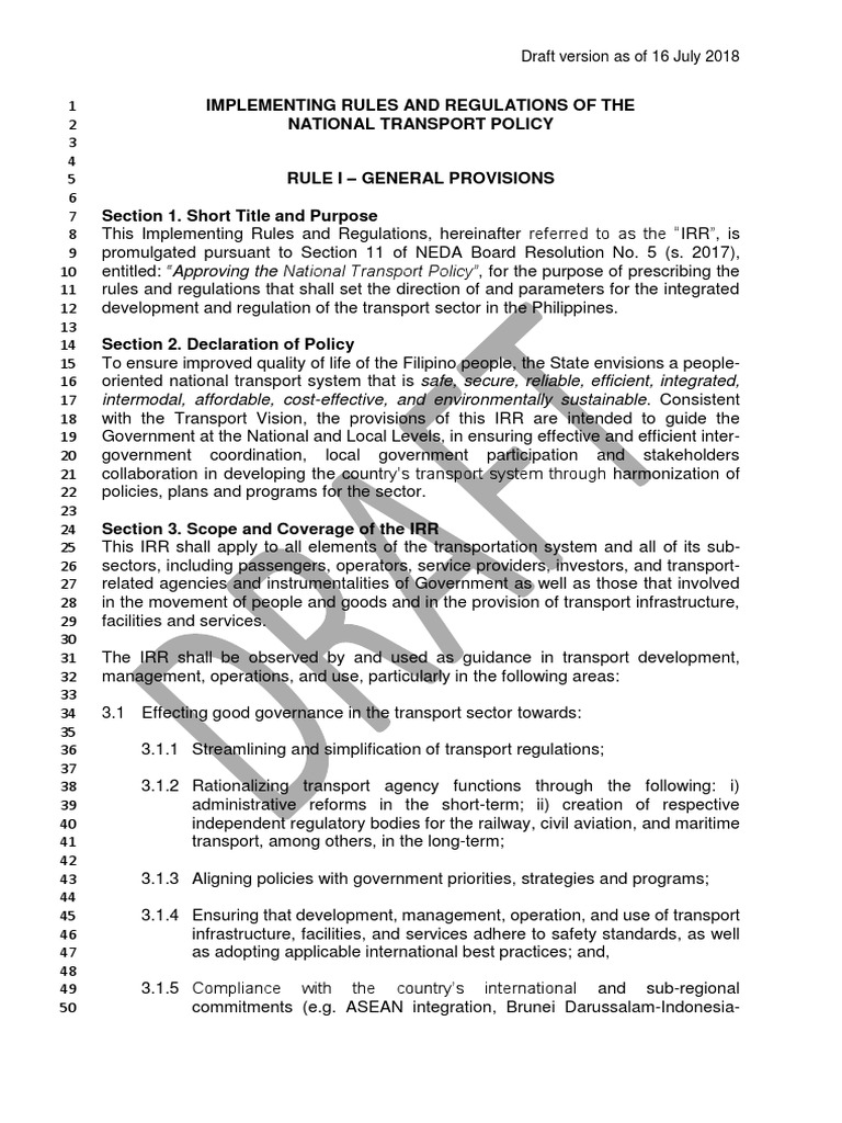 Ph National Transportation Policy Irr Draft As Of 16 July 2018 Public Private Partnership Public Transport